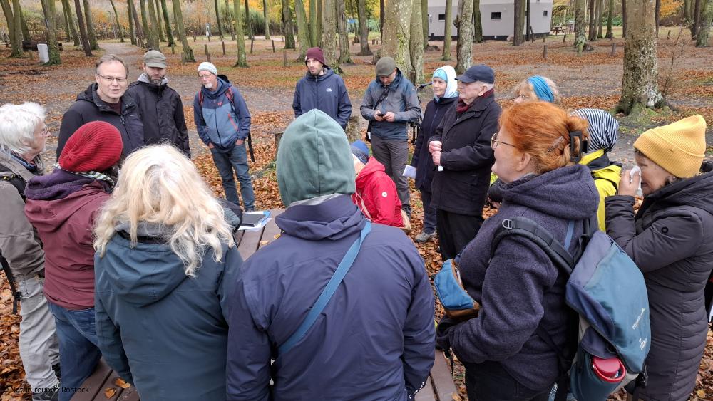 Die Geschichte dieses ehemaligen Naturfreundehauses ist natürlich besonders interessant für die NaturFreunde Region Rostock, die ihre Ortsgruppe erst im Januar 2024 neu gegründet haben. Am 2. November machten sie sich zu einer Wanderung in die Rostocker Heide auf, um vor Ort mehr über das ehemaligen Naturfreundehaus zu erfahren. Von Rostock-Torfbrücke aus führte der Weg zum heutigen Ostseecamp-Ferienpark Graal-Müritz. Dort begann dann die gemeinsame Spurensuche nach Hus Uhlenflucht.