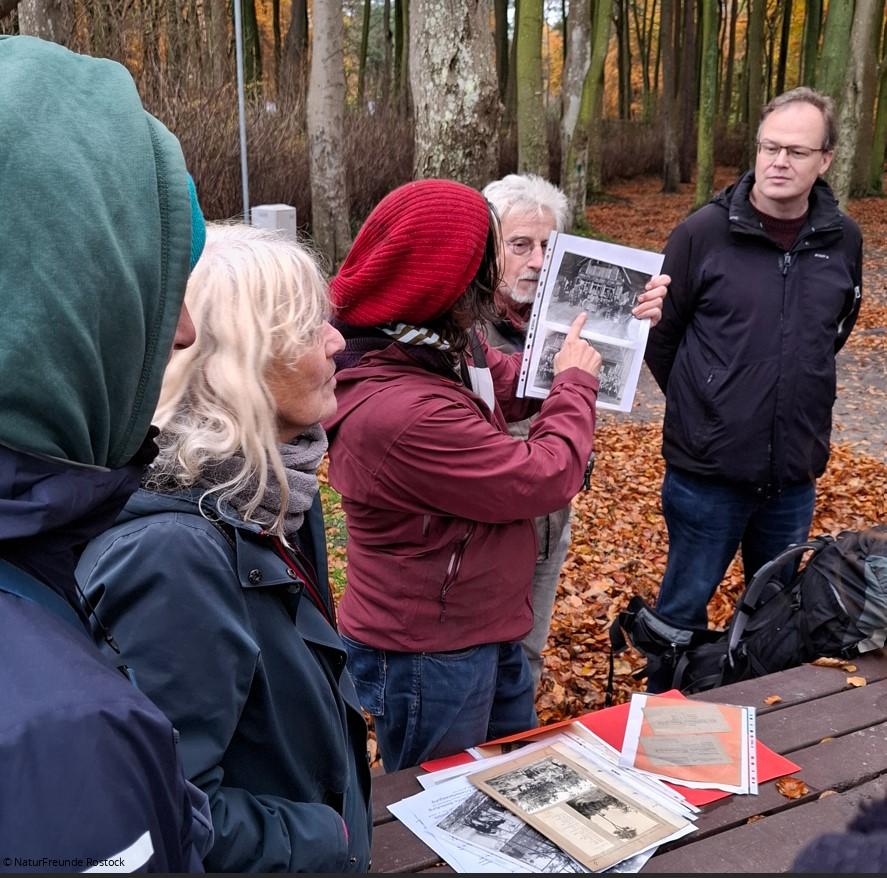Ortskundige aus Graal-Müritz sowie Rostocker und Schweriner NaturFreund*innen hatten vorher bereits begonnen, die Geschichte des alten Rostocker Naturfreundehauses zu recherchieren und präsentierten an diesem sonnigen Novembertag einige Ergebnisse: