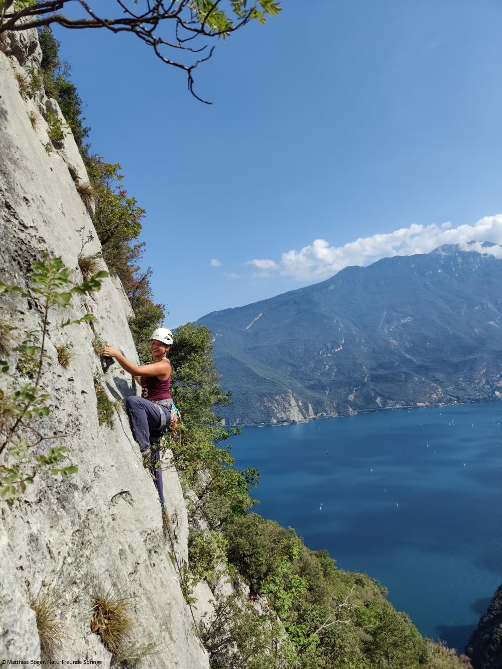 Am zweiten Tag ging es dann bereits in die ersten (kurzen) Mehrseillängen. Und zwischendurch immer wieder der Blick auf den Gardasee – bei strahlendem Sonnenschein. Ein Paradebeispiel für das natursportliche Miteinander, das wir als NaturFreund*innen anstreben! Der Folgetag stand dann ganz im Zeichen einer großen Mehrseillängentour: sieben Seillängen in Wechselführung. Bei hochsommerlichen Temperaturen waren diejenigen froh, die wenigstens einen ihrer Standplätze im schattigen Gelände einrichten konnte.