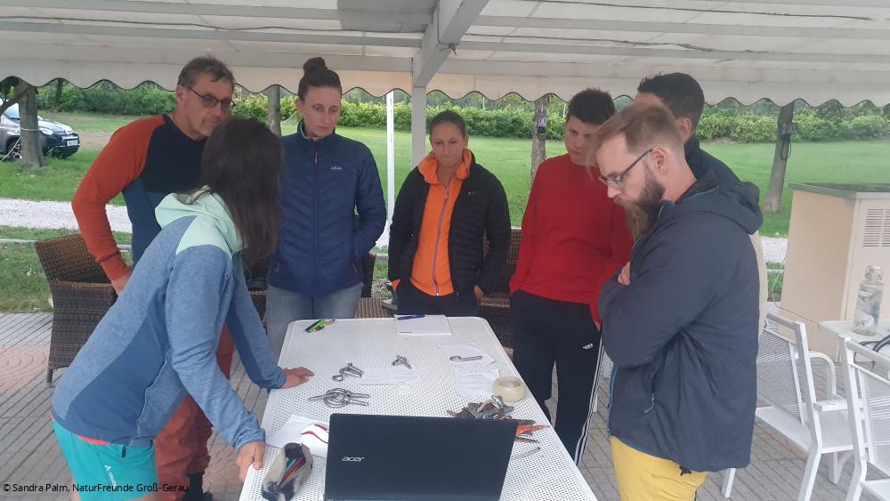 Damit wir auf den Klettertag vorbereitet waren, wurde vorab jeweils ein*e Teilnehmer*in mit der Zusammenstellung der gebietsbezogenen Informationen (Länge der Routen/Seile, Zustieg und zu erwartende Wetterverhältnisse) beauftragt. Vor dem Start wurden dann die Teilnehmer*innen gebrieft und die Ausrüstung gecheckt.