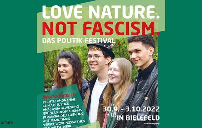 Das Politik-Festival „Love Nature. Not Fascism.“ bringt junge ökologisch und politisch engagierte Menschen zwischen 16 und 26 Jahren aus ganz Deutschland zusammen. Zahlreiche Workshops und Vorträge bieten die Möglichkeit, sich intensiv mit dem Themenfeld „Naturschutz, Umweltschutz und Rechtsextremismus“ auseinanderzusetzen. Mit dem erworbenen Wissen kann antidemokratischer Natur- und Umweltschutz im eigenen Umfeld rechtzeitig identifiziert werden.